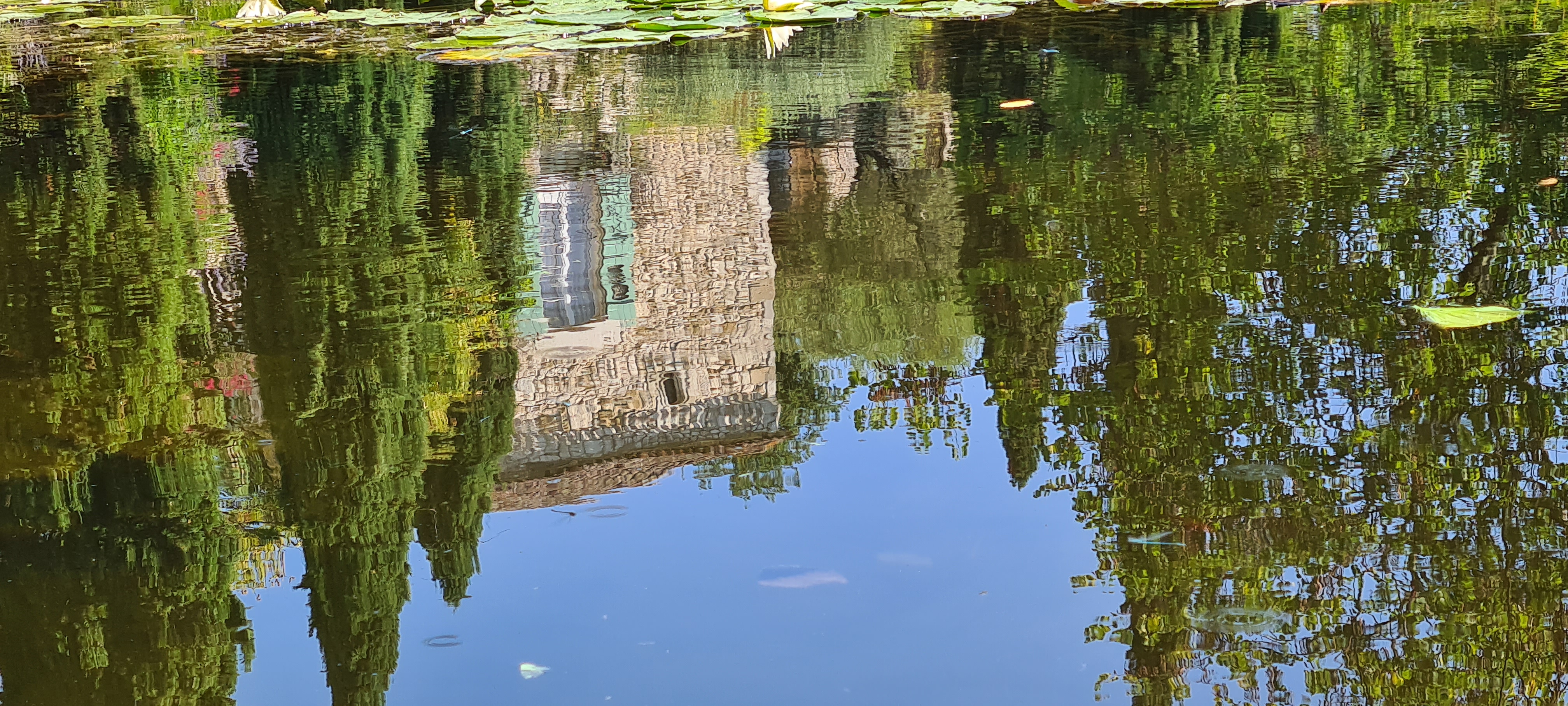 Joli jardin ! Parcours des senteurs et bassin avec fontaine autour d'une ferme fortifiée.
