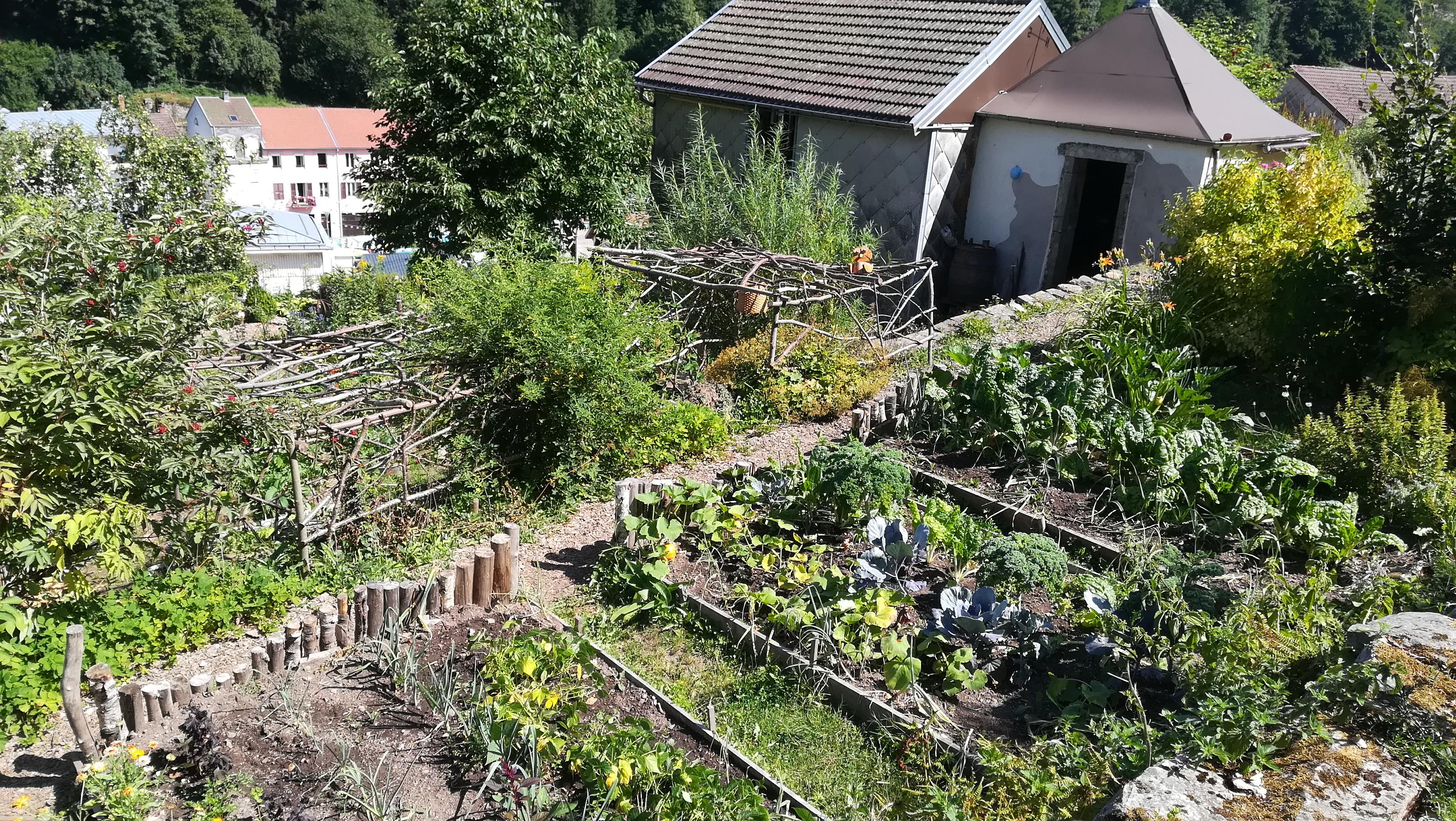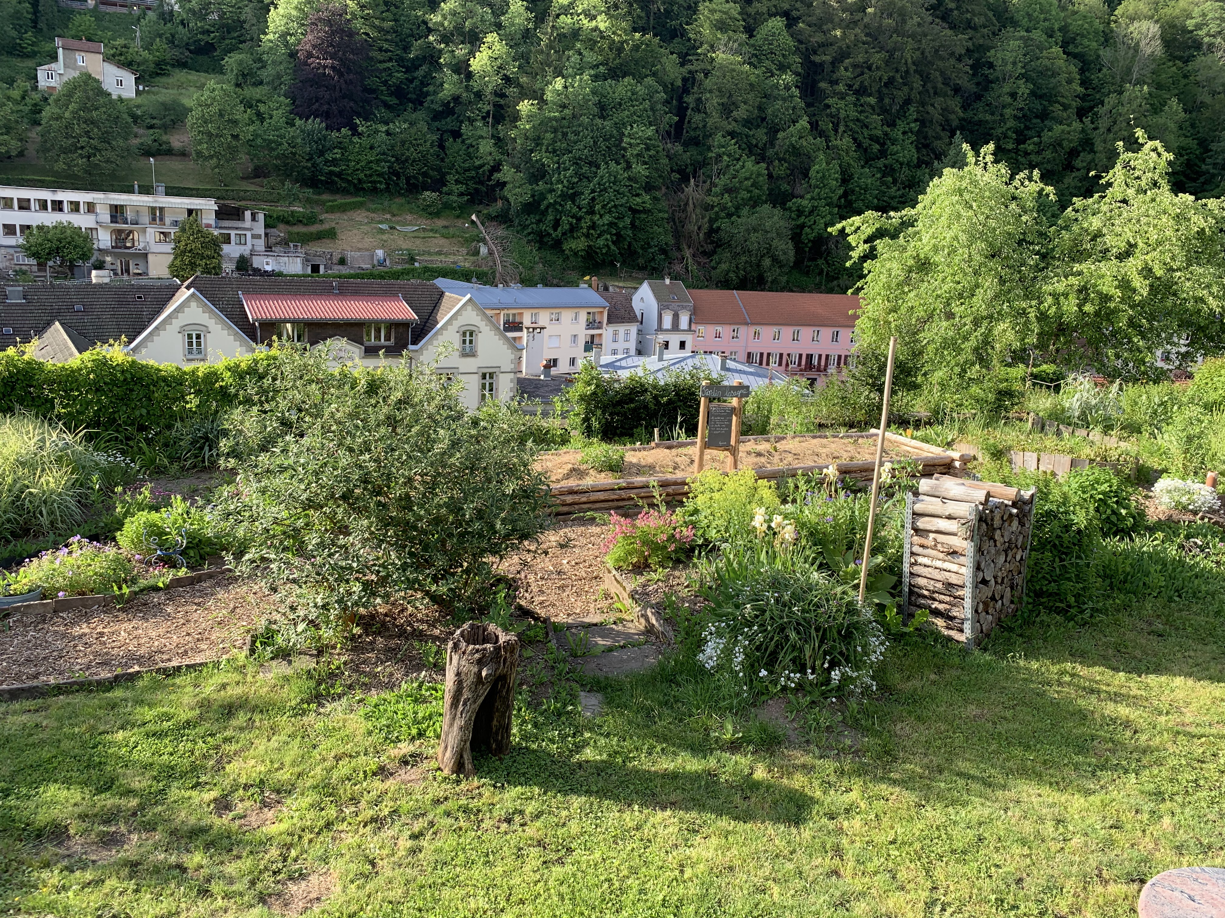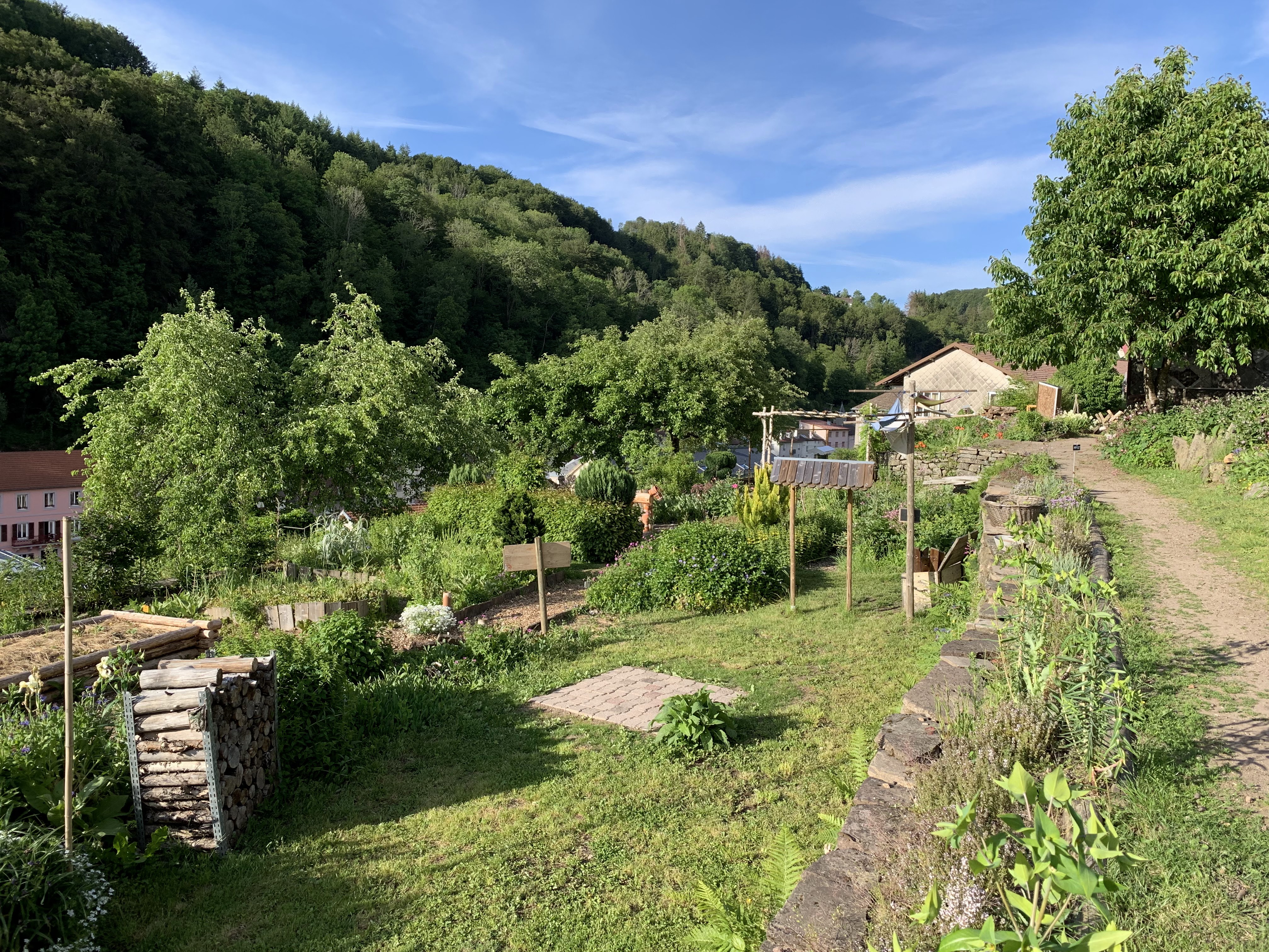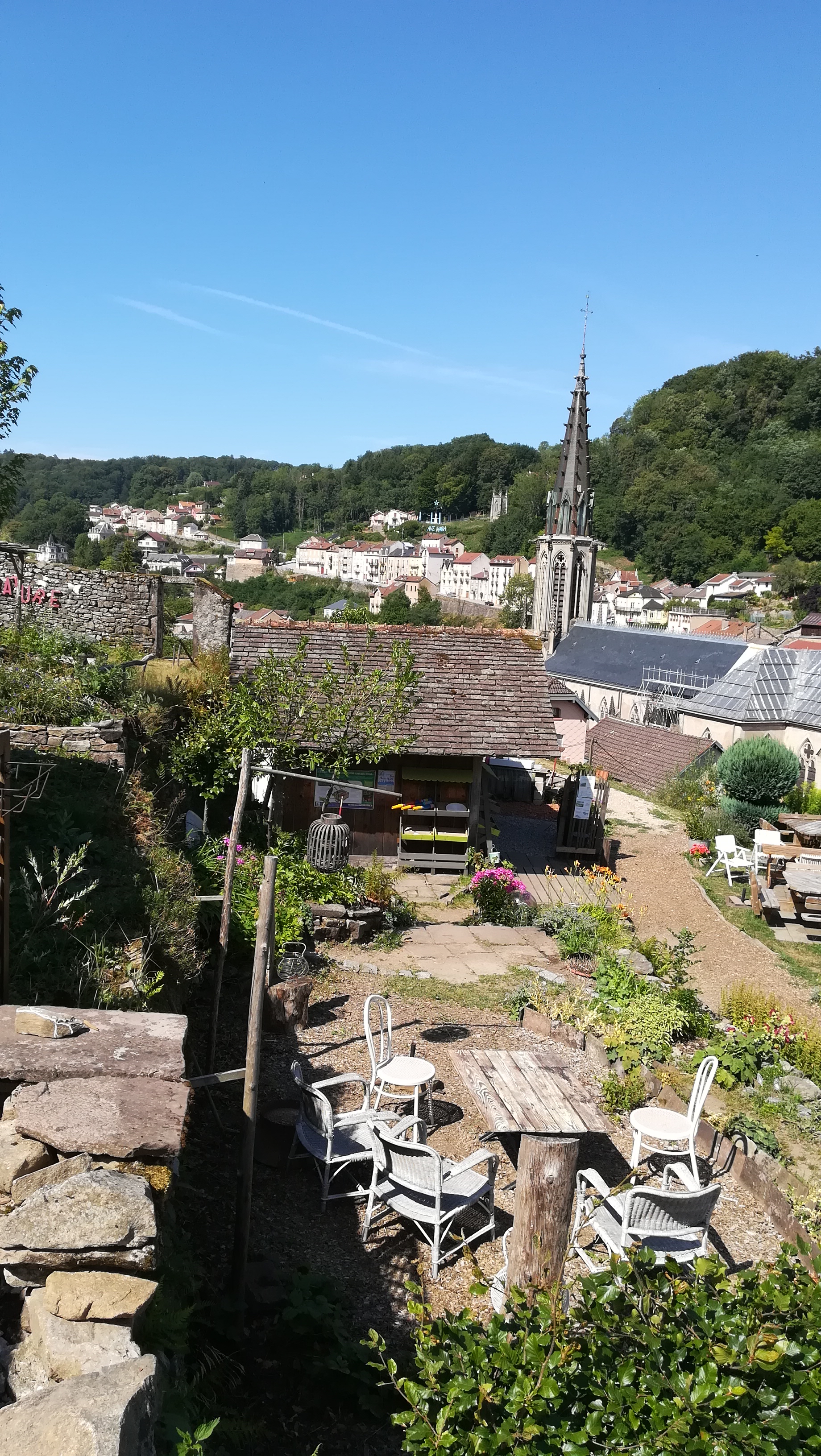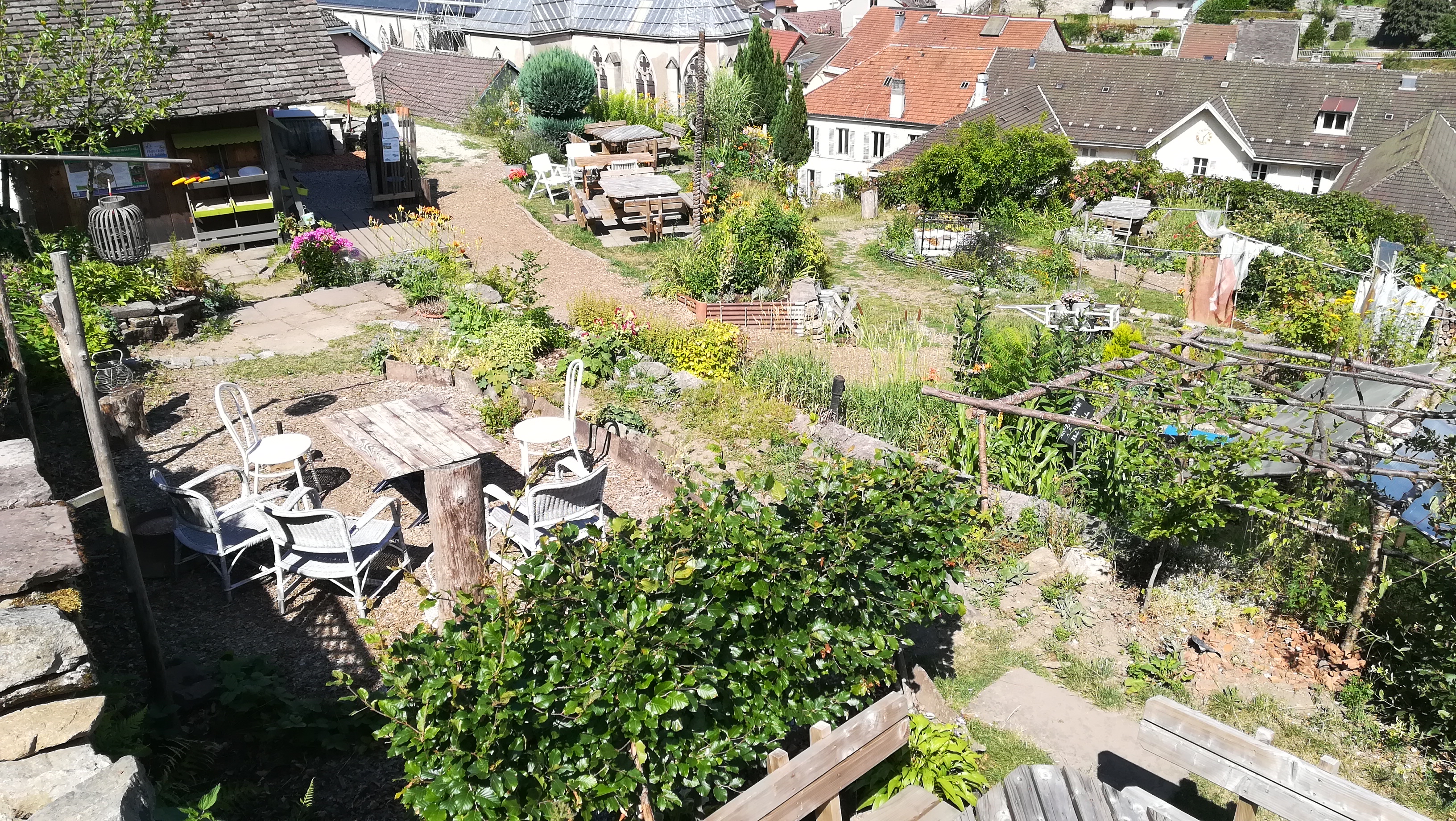 Des jardins en hauteur où les différentes formes de cultures se cotoyent, des objets hétéroclites, des tables et des bancs, des escaliers et des sentiers pentus et une belle vue sur Plombieres les bains.