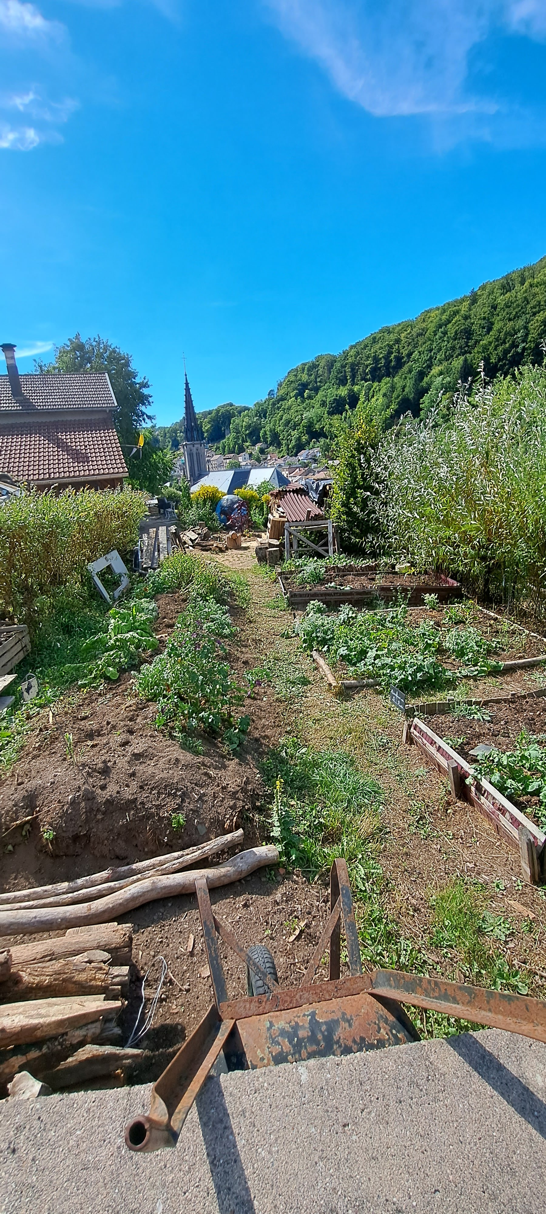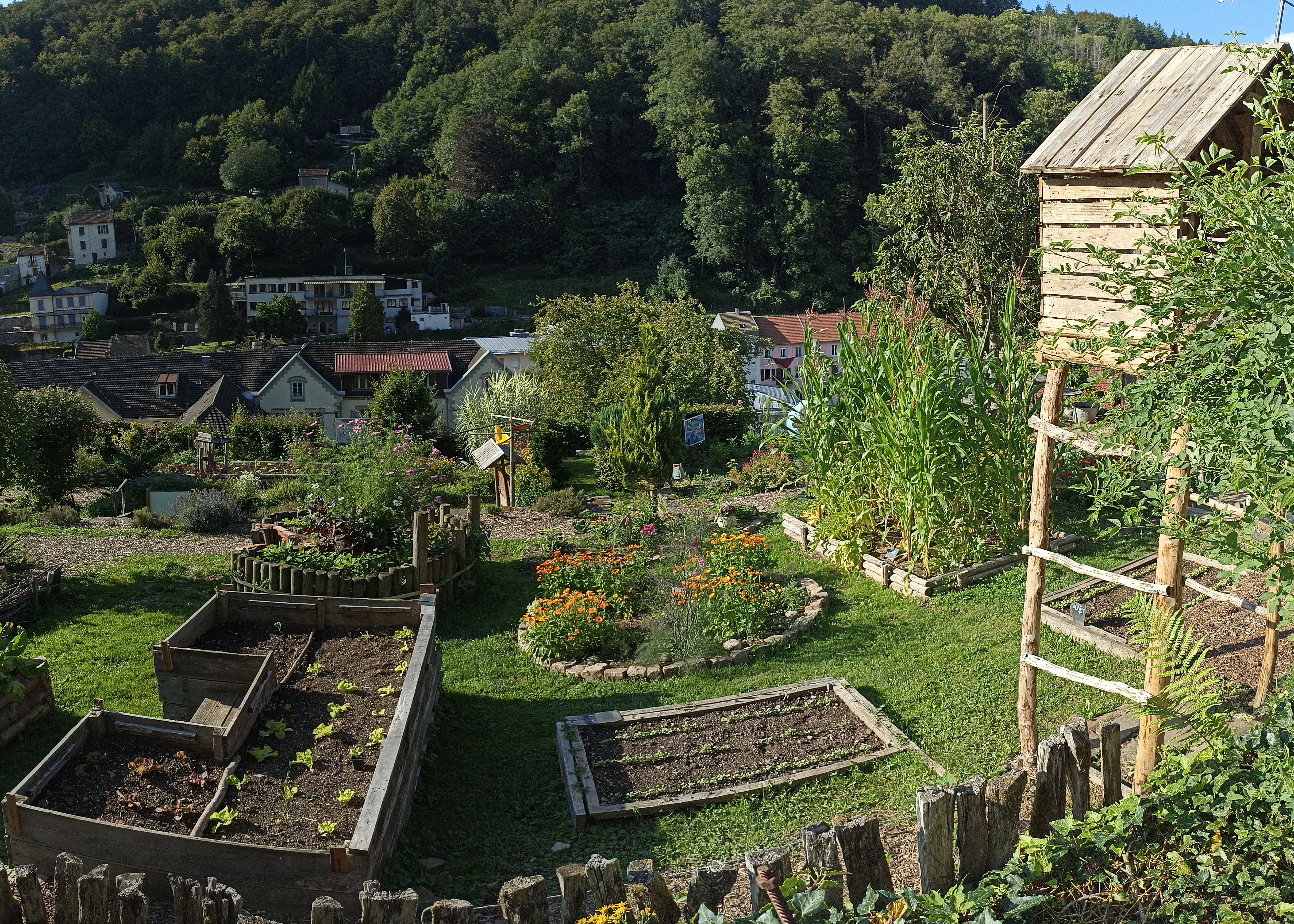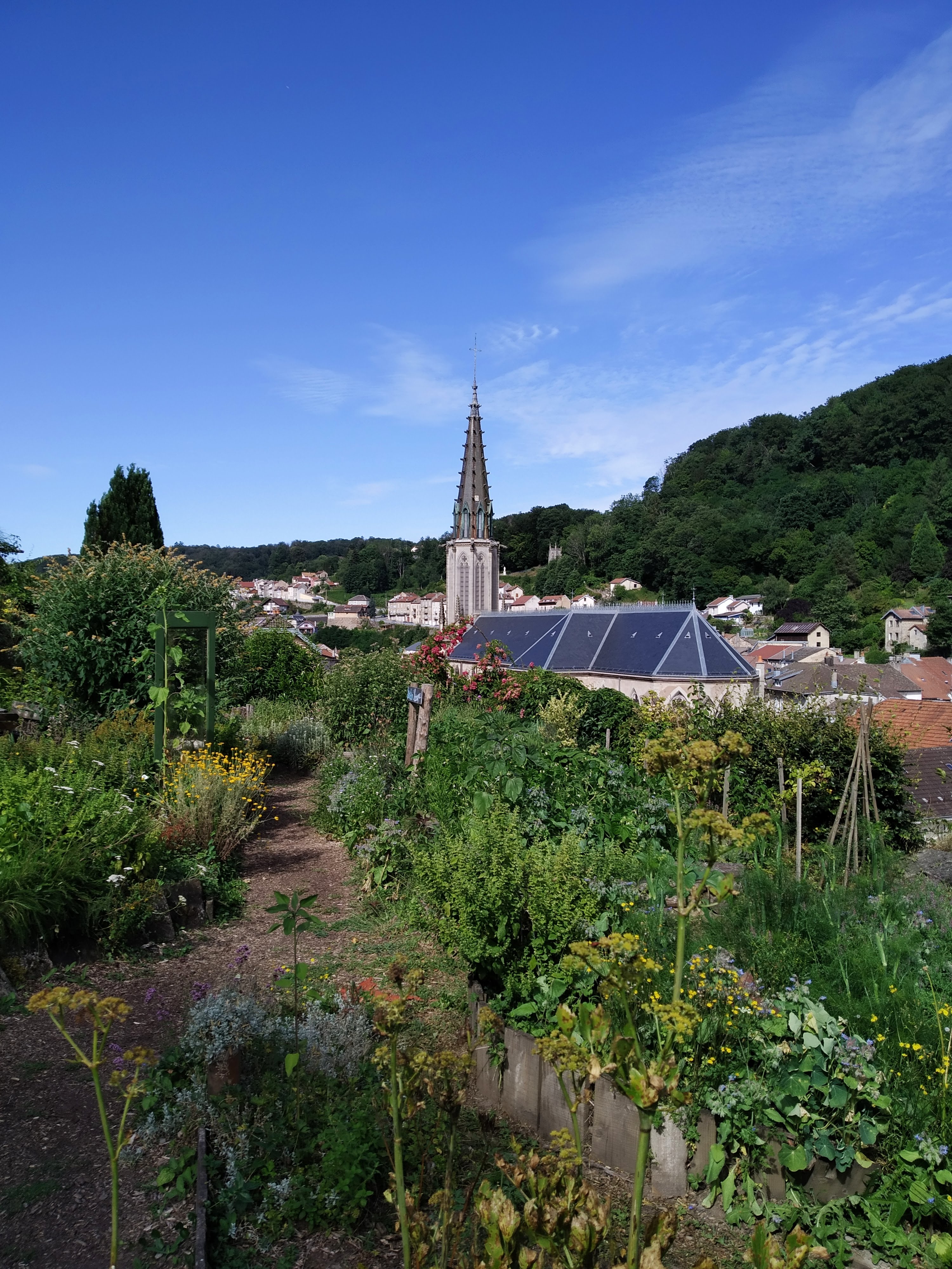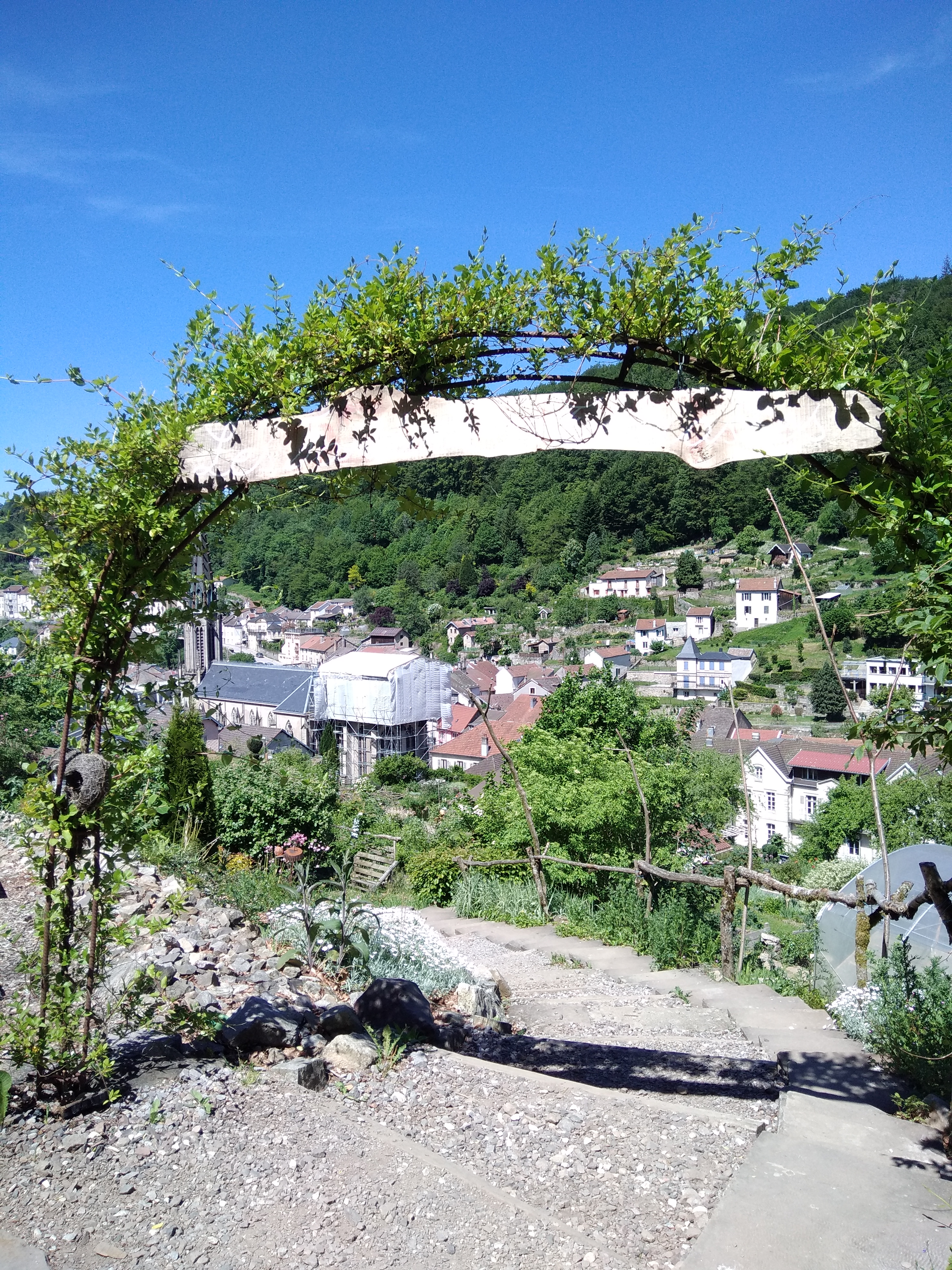 Des jardins en hauteur où les différentes formes de cultures se cotoyent, des objets hétéroclites, des tables et des bancs, des escaliers et des sentiers pentus et une belle vue sur Plombieres les bains.