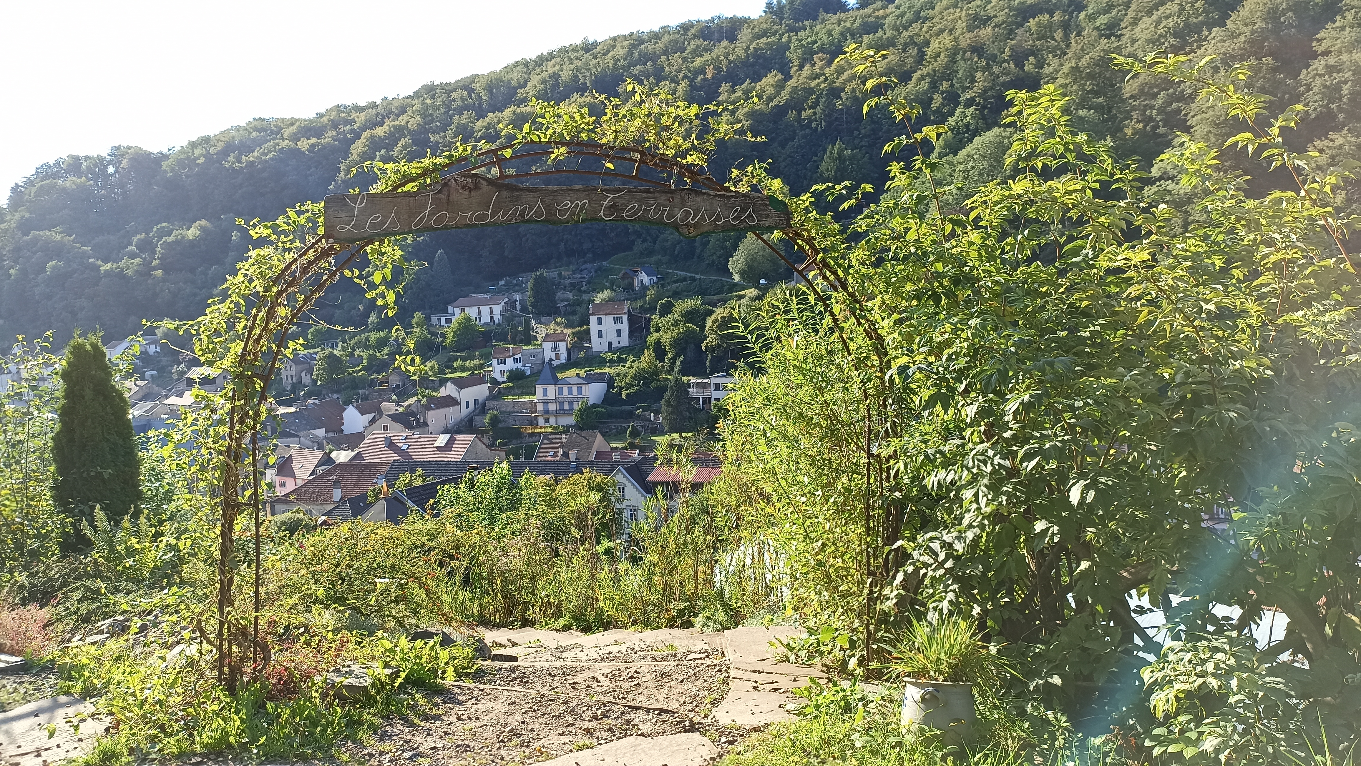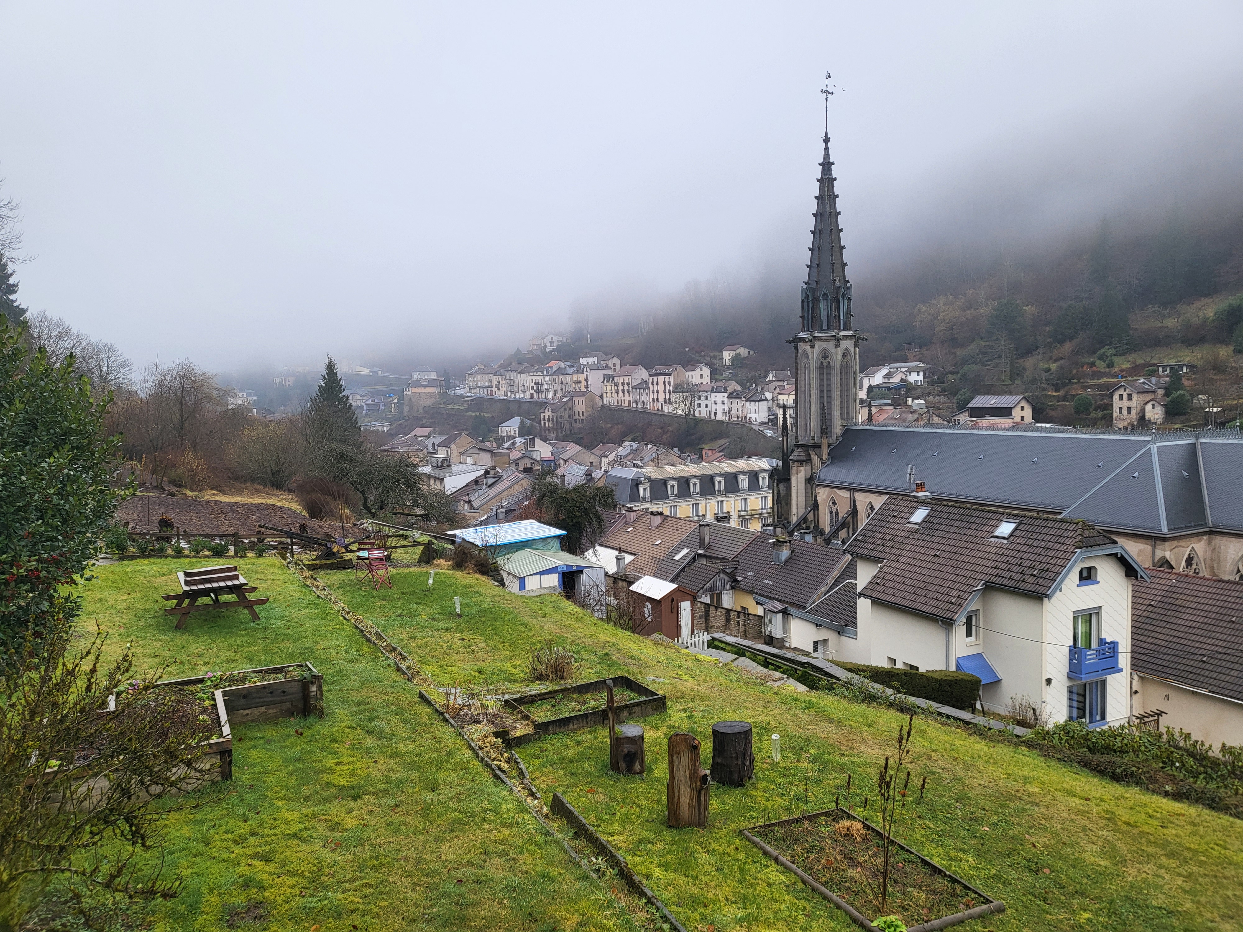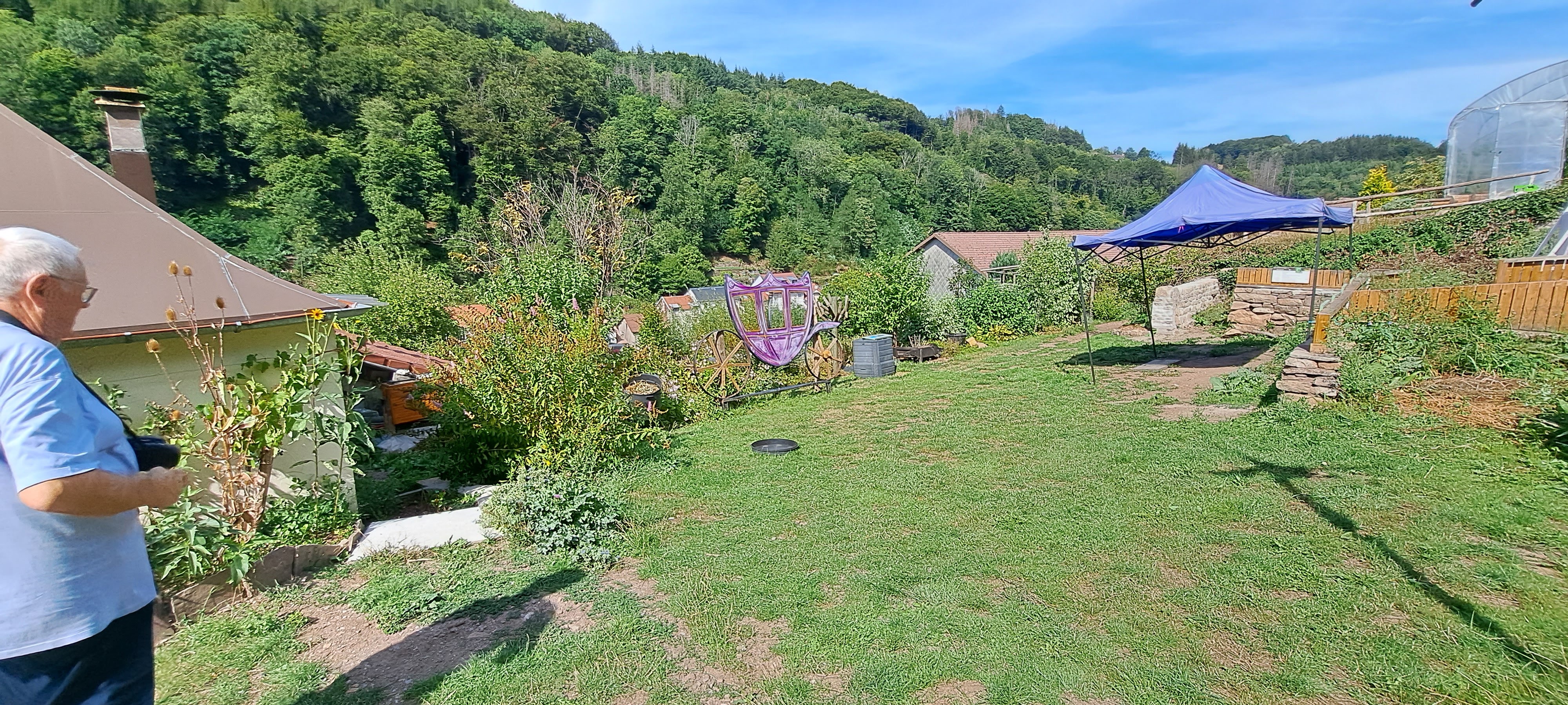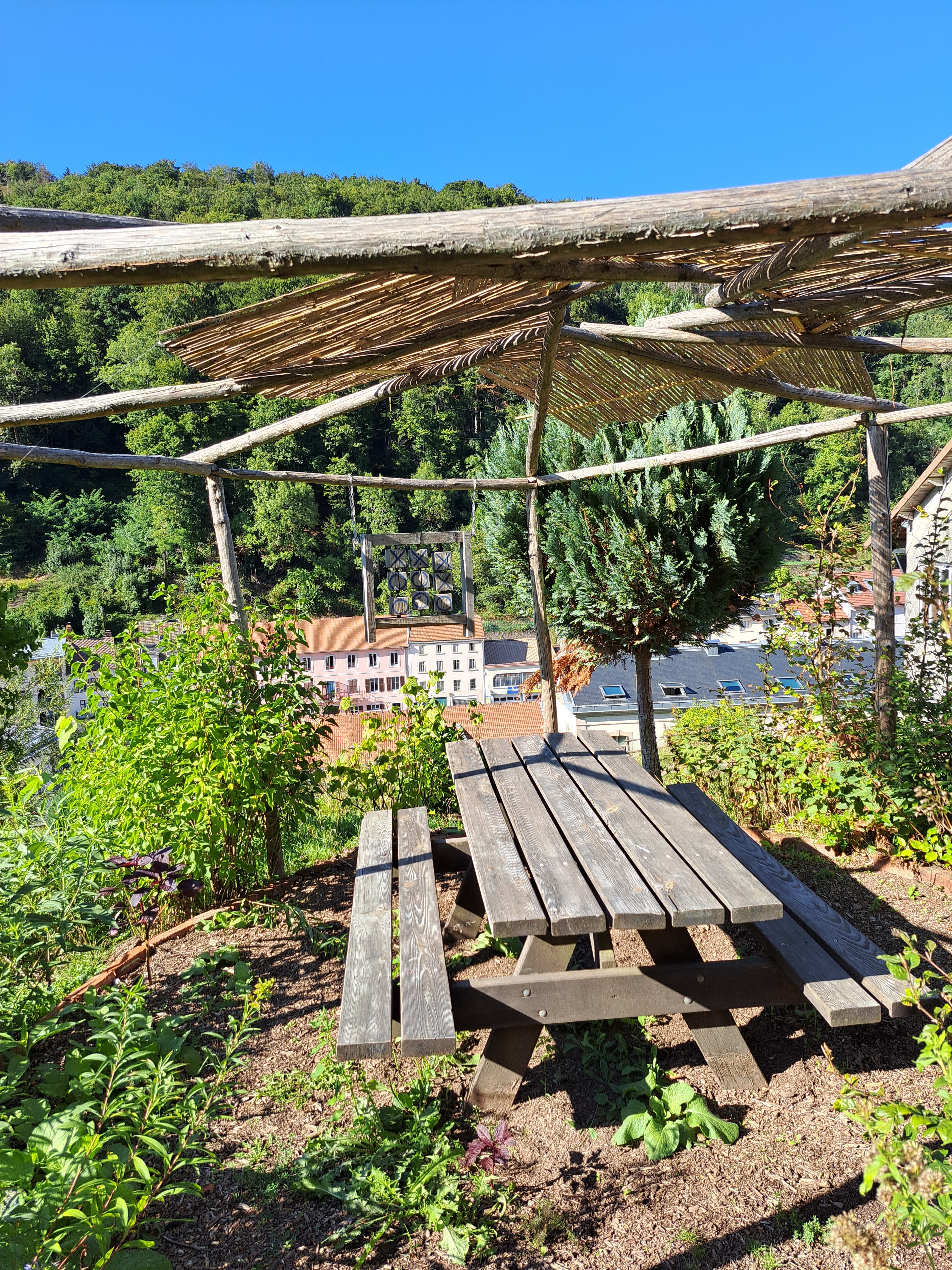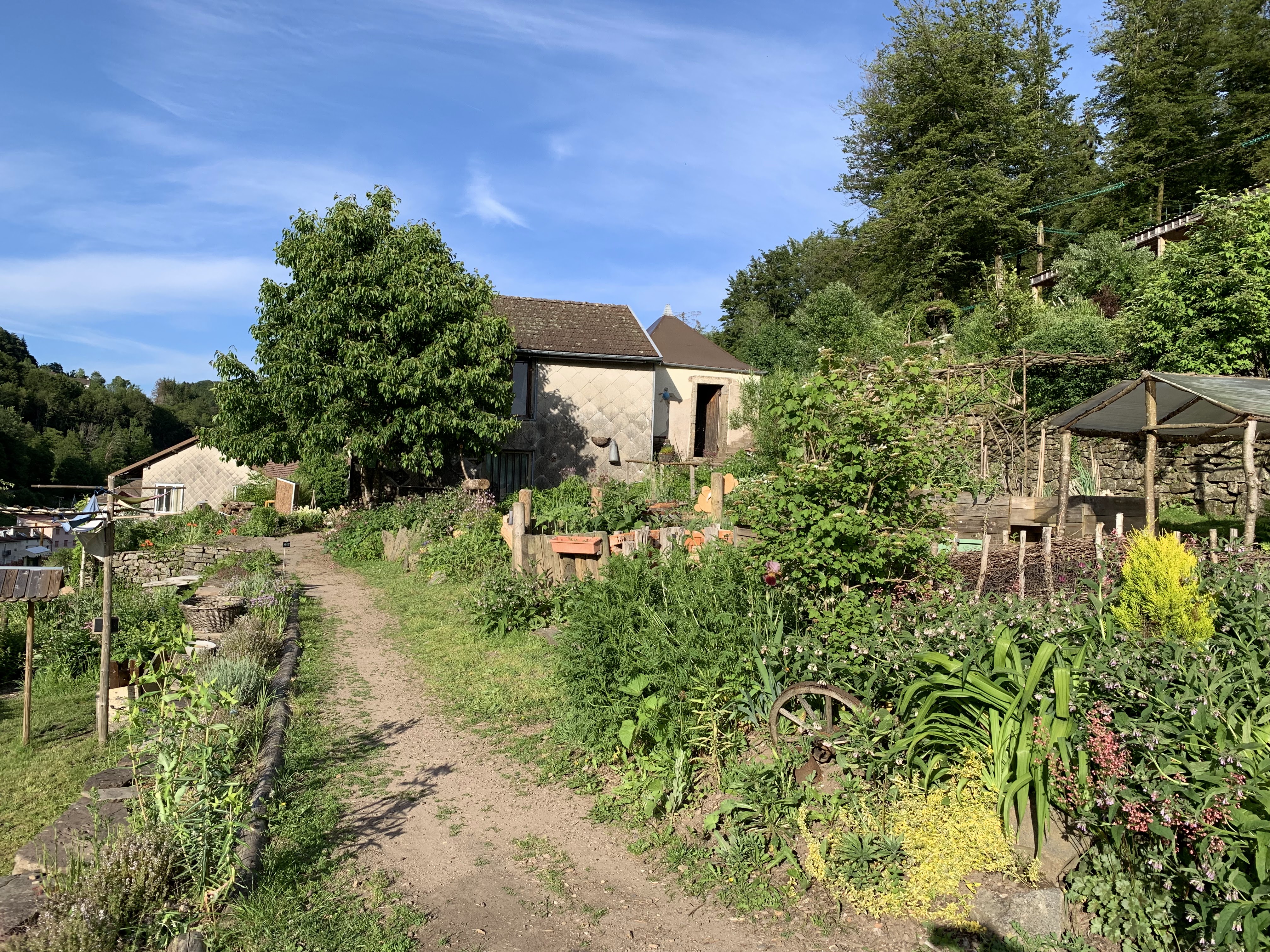 Des jardins en hauteur où les différentes formes de cultures se cotoyent, des objets hétéroclites, des tables et des bancs, des escaliers et des sentiers pentus et une belle vue sur Plombieres les bains.