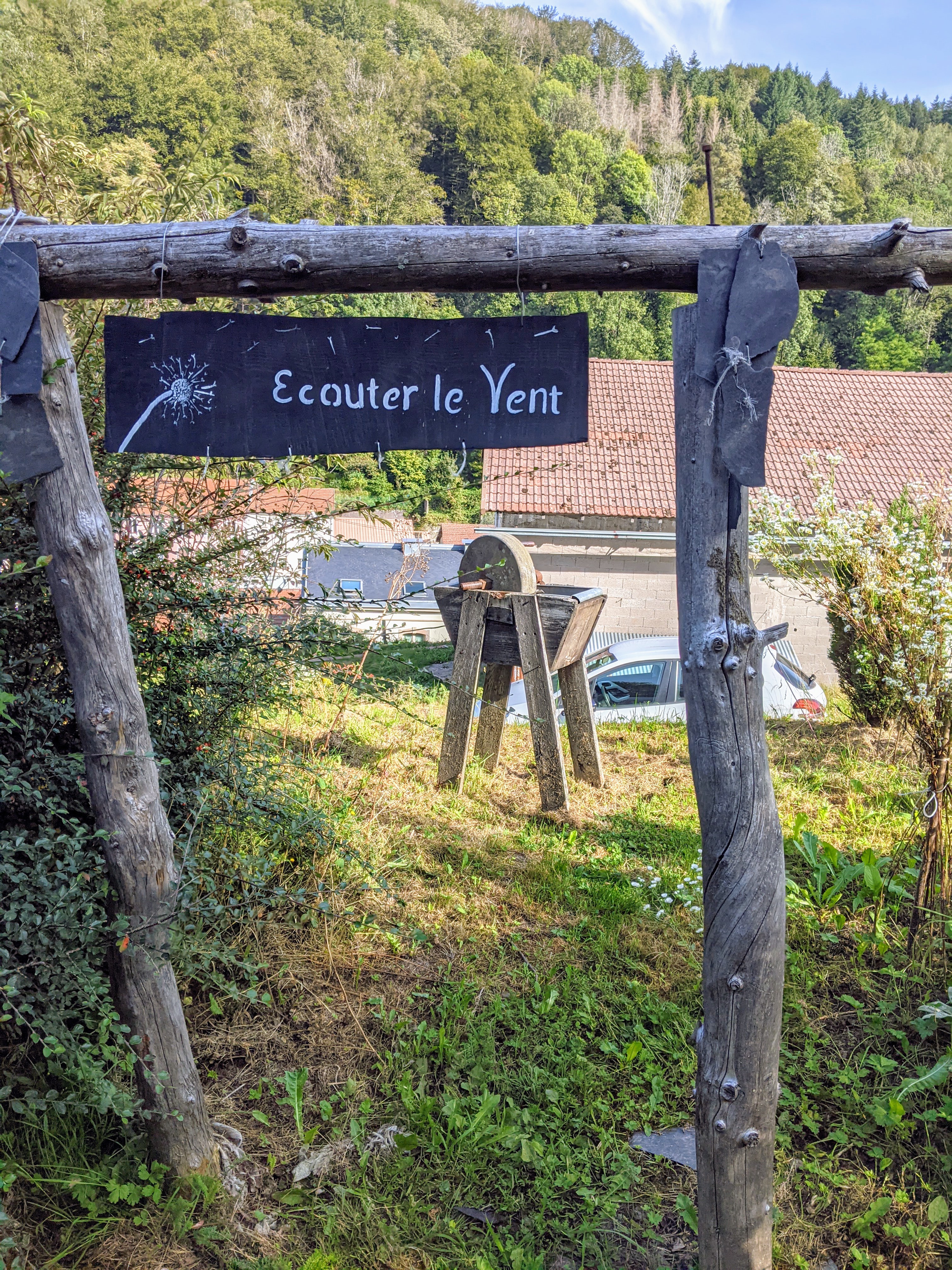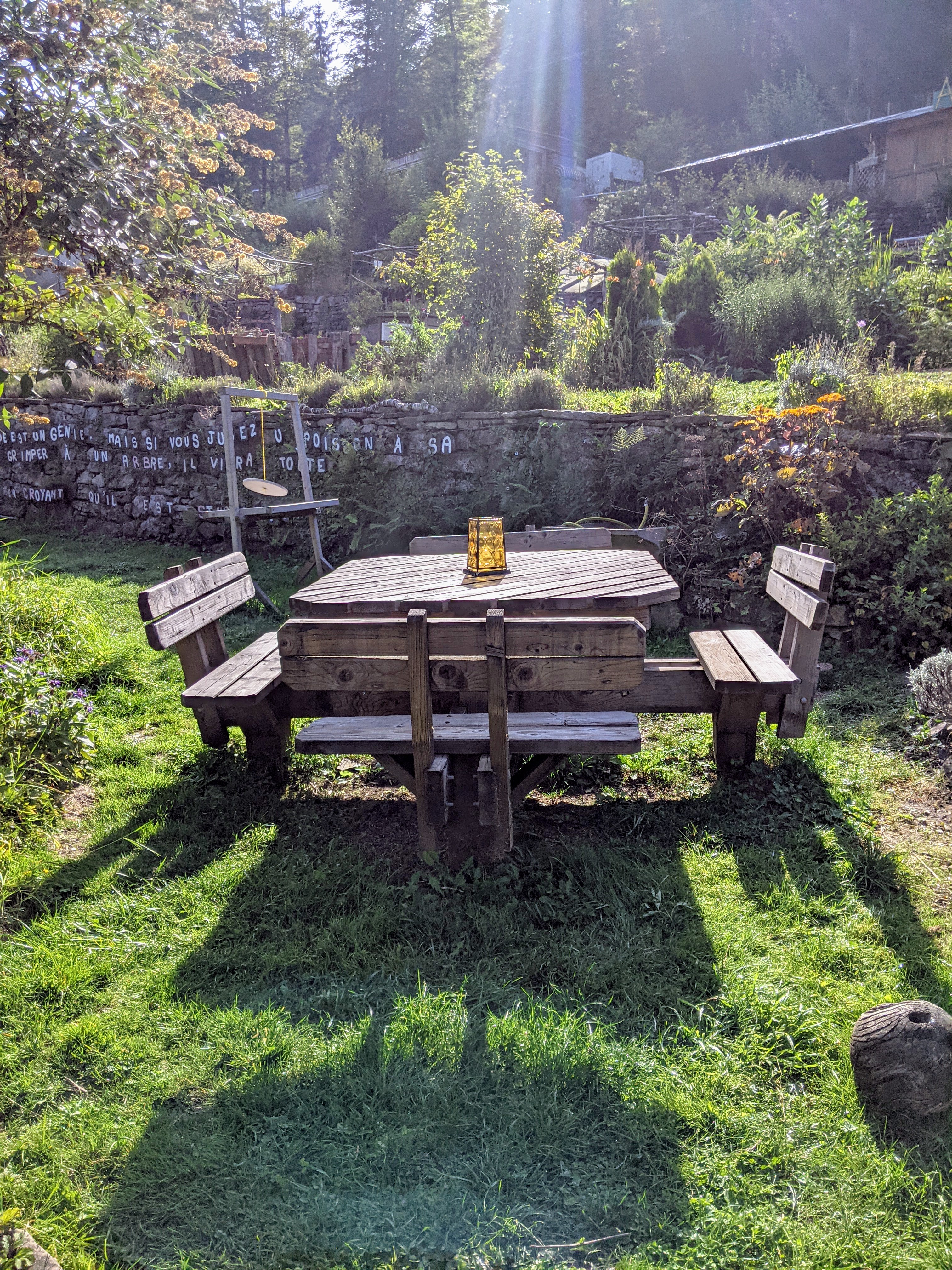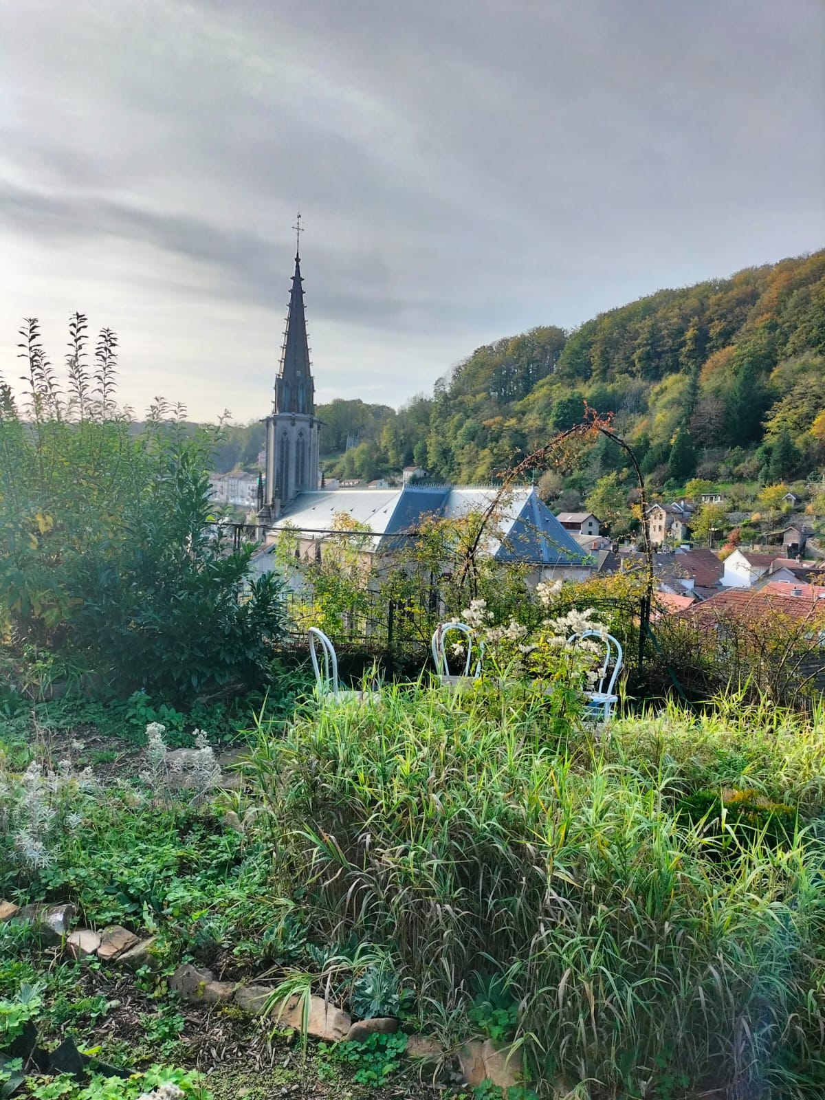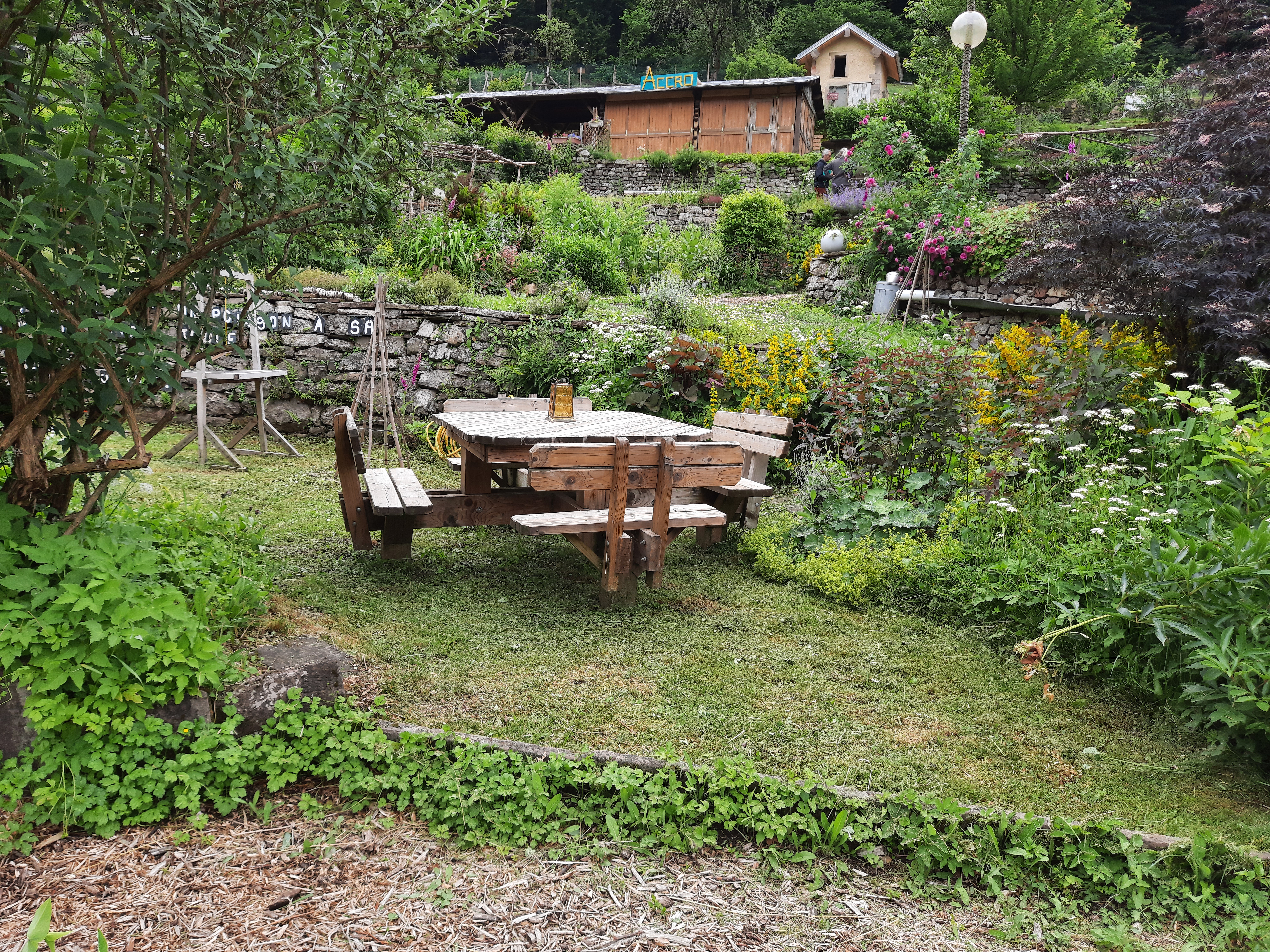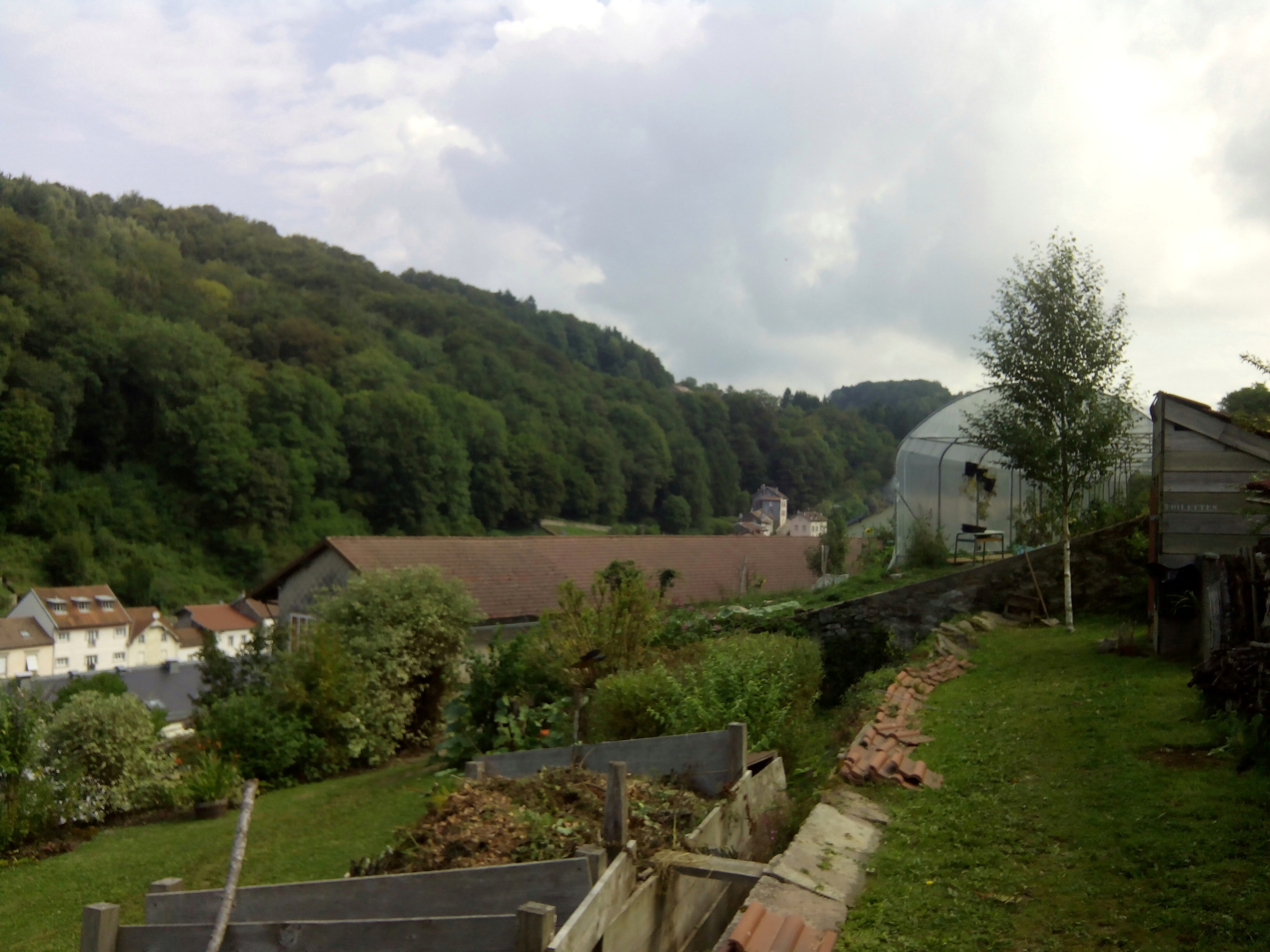 Des jardins en hauteur où les différentes formes de cultures se cotoyent, des objets hétéroclites, des tables et des bancs, des escaliers et des sentiers pentus et une belle vue sur Plombieres les bains.