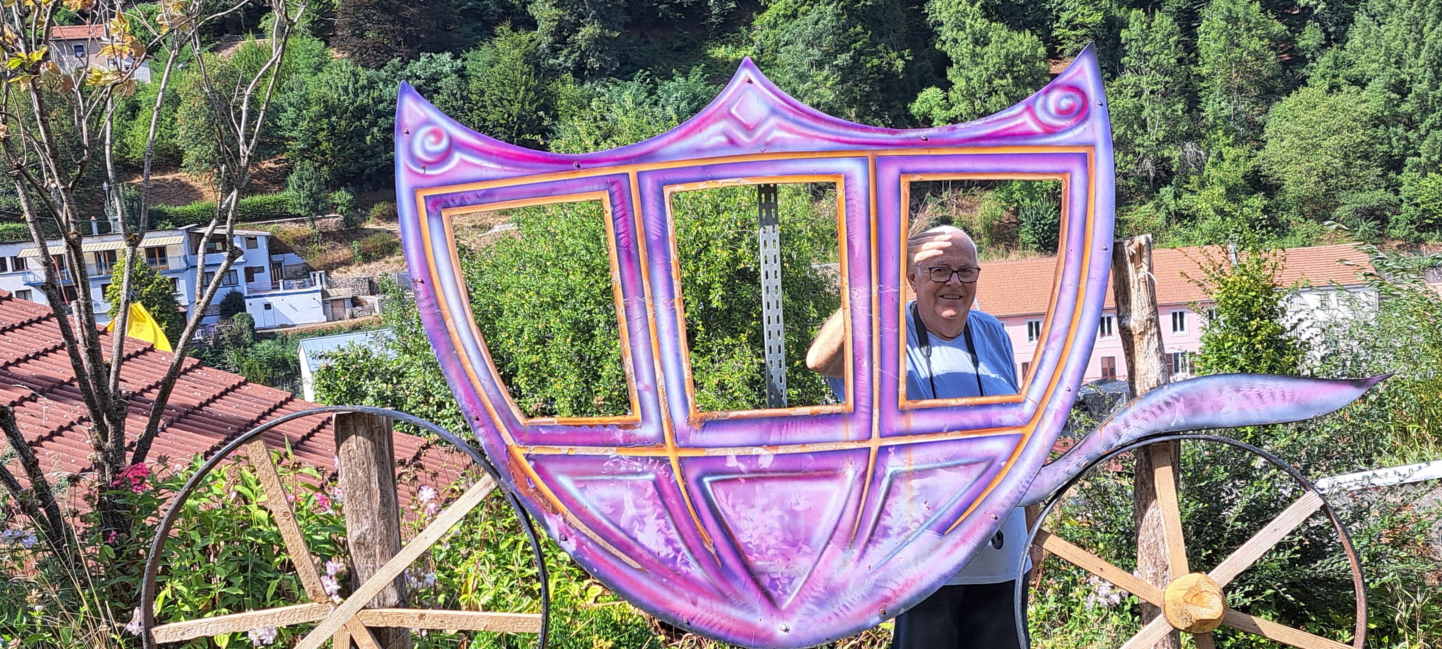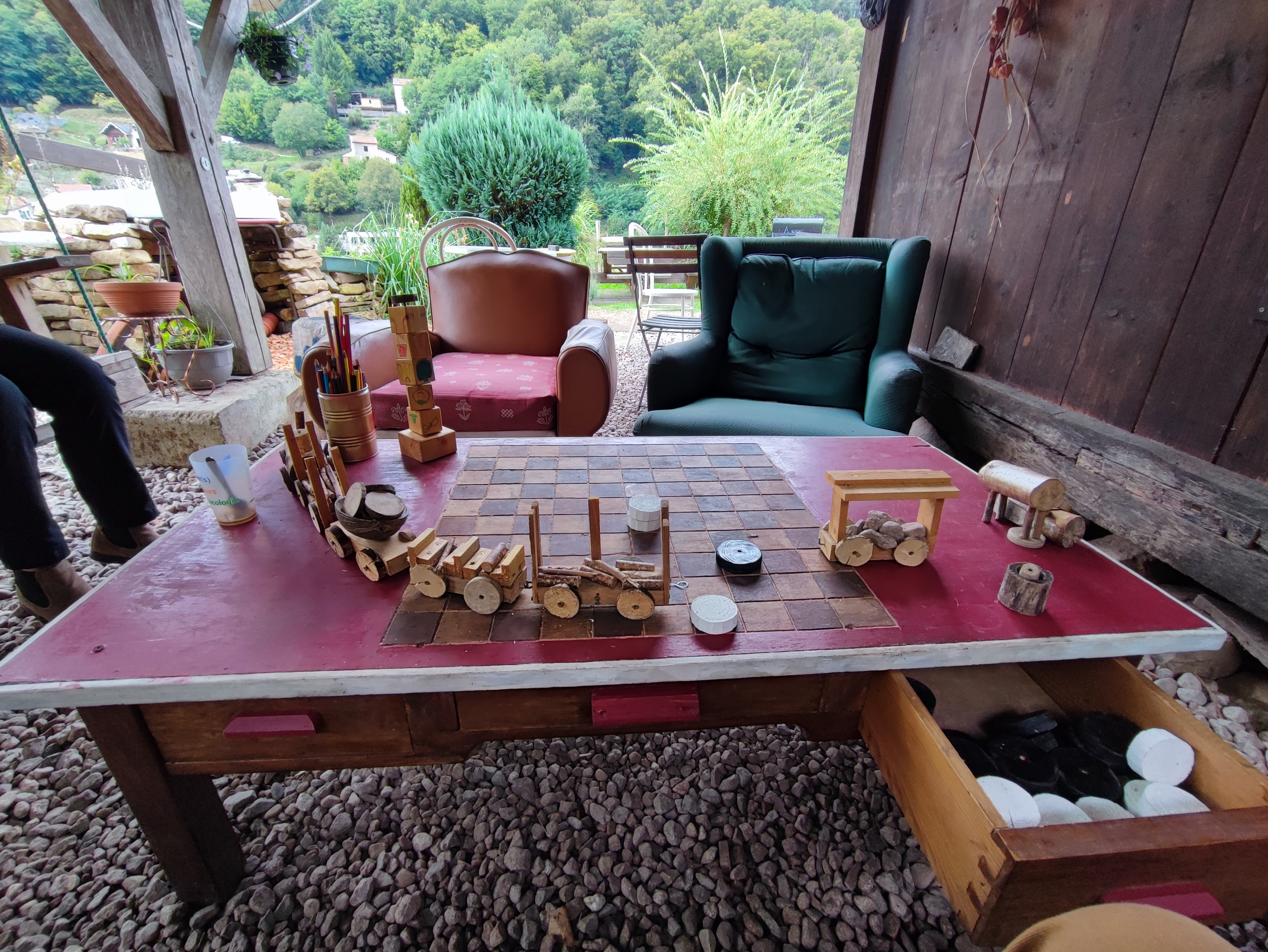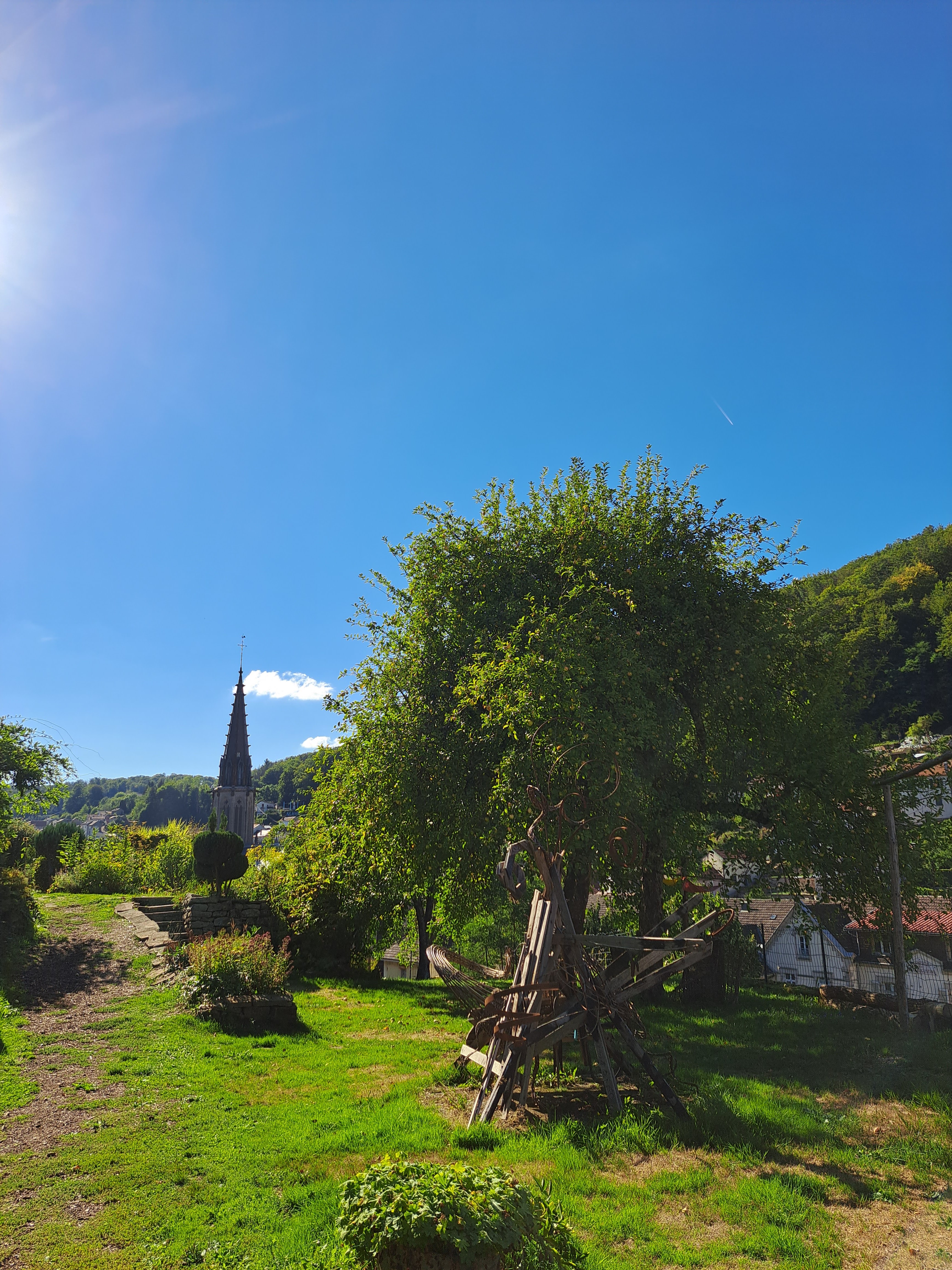 Endroit atypique, jardin vu autrement avec des objets détournés, avec une vue sur la ville de Plombières