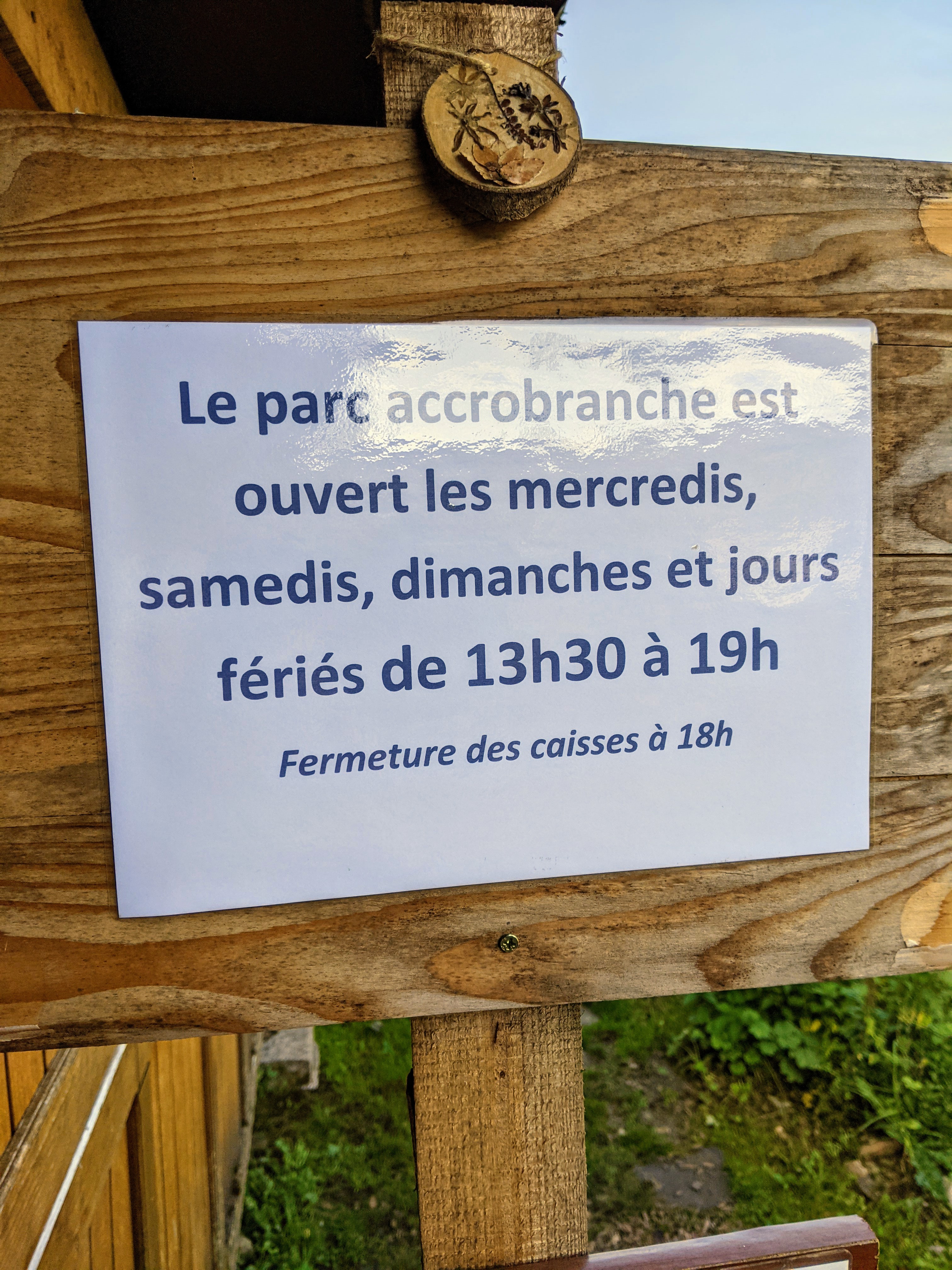 Le 28 octobre, vacances scolaires,après vérification des horaires d ouverture, nous restons devans la porte car personne ne se présente pour ouvrir l accrobranche à 13h30. Au téléphone, pas de réponse. Dommage !!!