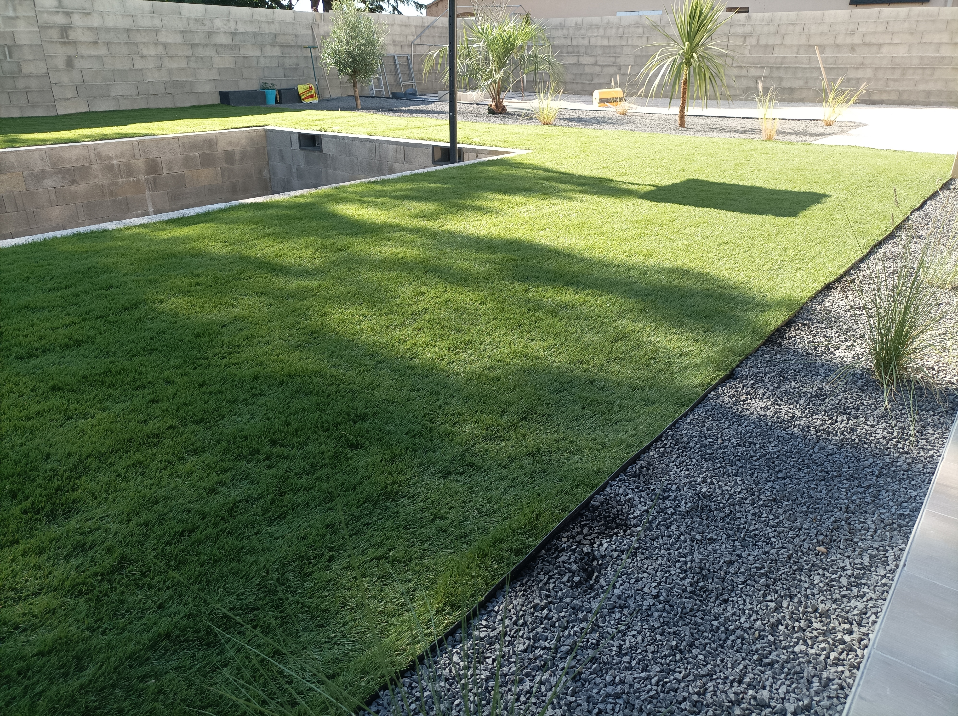 Posté le 03/09/2023 à 13:21"Bonjour, Suite à notre visite au magasin il y a un an, on s'était basés sur un échantillon. Coup de cœur pour Soleil/Marseille. On a acheté le rouleau de 50 mètres carrés avec kit de pose. On a longuement attendu la livraison de notre maison pour enfin dérouler le tapis. Cet hiver, nous retirerons le gazon pour mettre à niveau avec du sable. Actuellement, nous avons enlevé le maximum de cailloux pour poser le gazon et profitons de ce bel été. Avec deux enfants en bas âge, nous avons passé toutes nos fins d'après-midi dans le jardin pour profiter de ce gazon excellent, agréable sous les pieds et surtout confortable. Quand nous aurons posé le sable, ce sera un matelas. Encore merci à l'équipe pour tous les conseils et pour votre produit de très haute qualité. Bien cordialement"