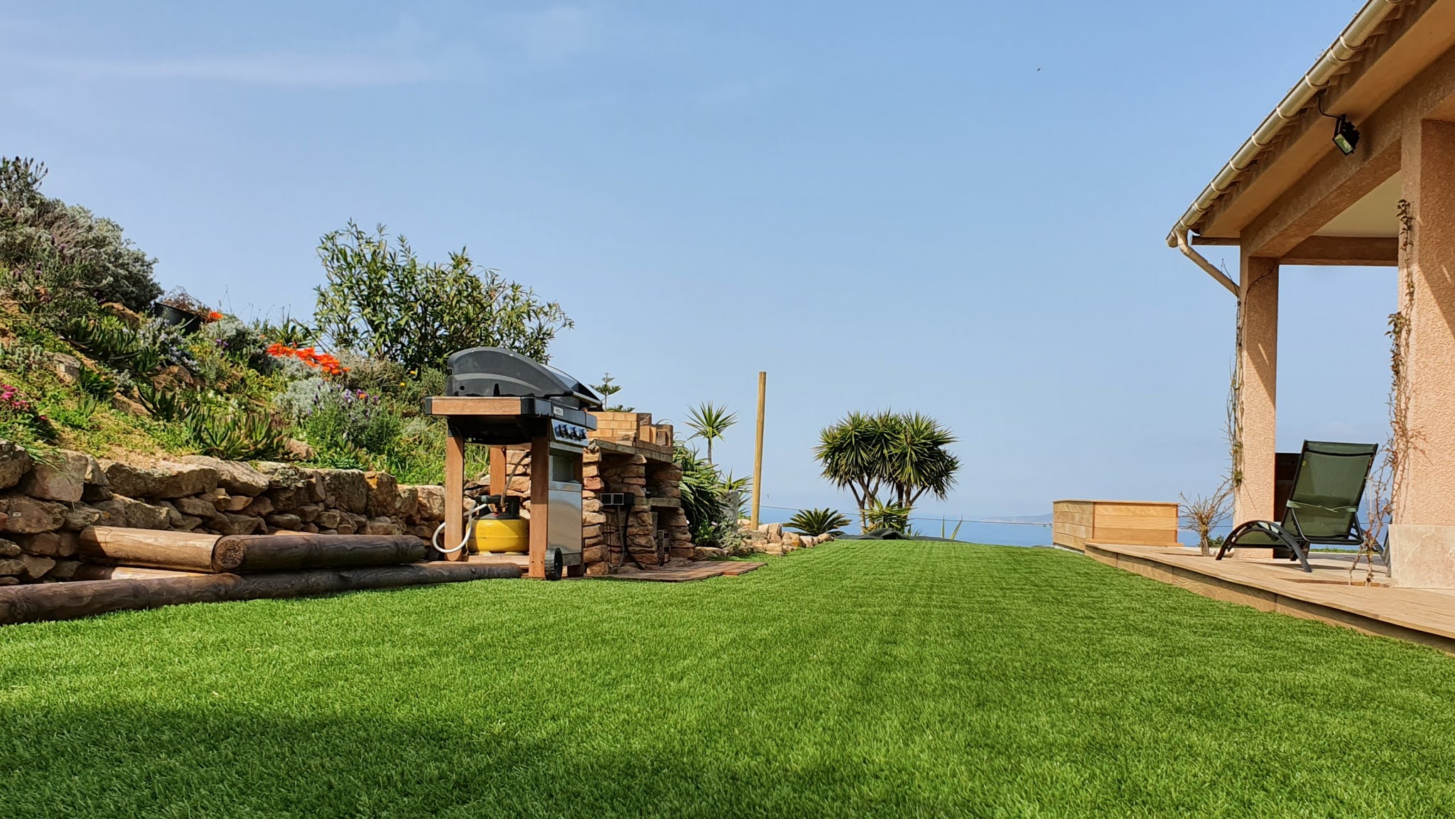 Posté le 29/06/2020 à 10:18"En remplacement d'une partie en herbe qui sèche l'été en Corse, nous sommes très satisfait du rendu de cette pelouse synthétique (modèle Montpellier, réaliste et agréable). La pose du rouleau de 25 x 4 m a été plus aisée que prévu à 3 personnes. Nous avons des chambres d'hôtes et cette pelouse valorise très bien notre jardin."
